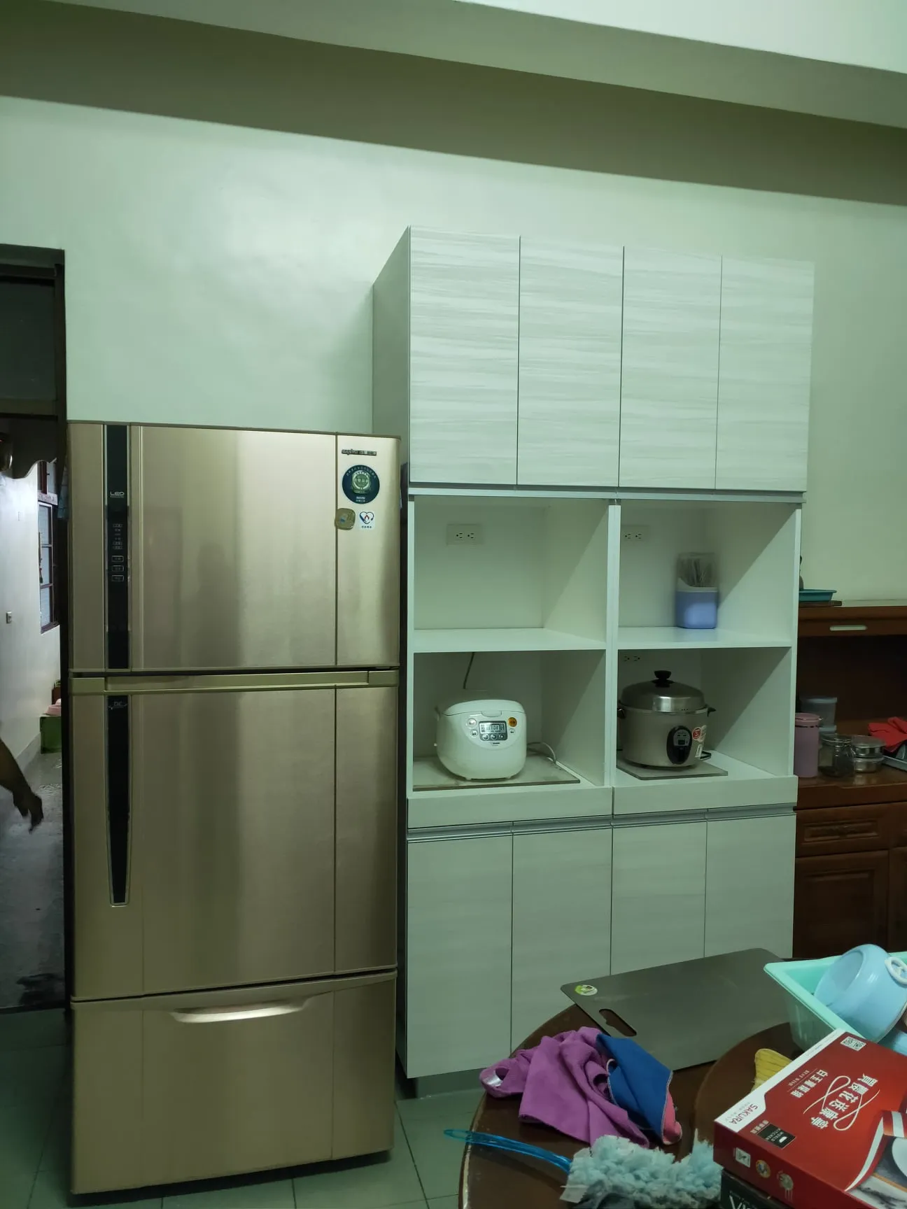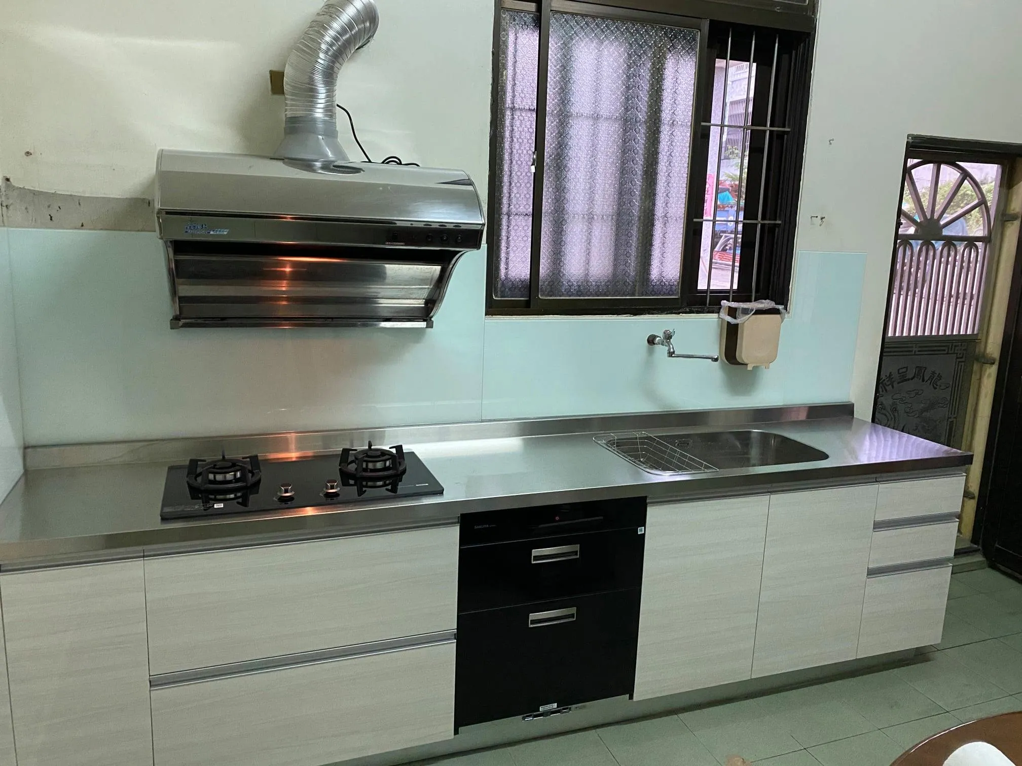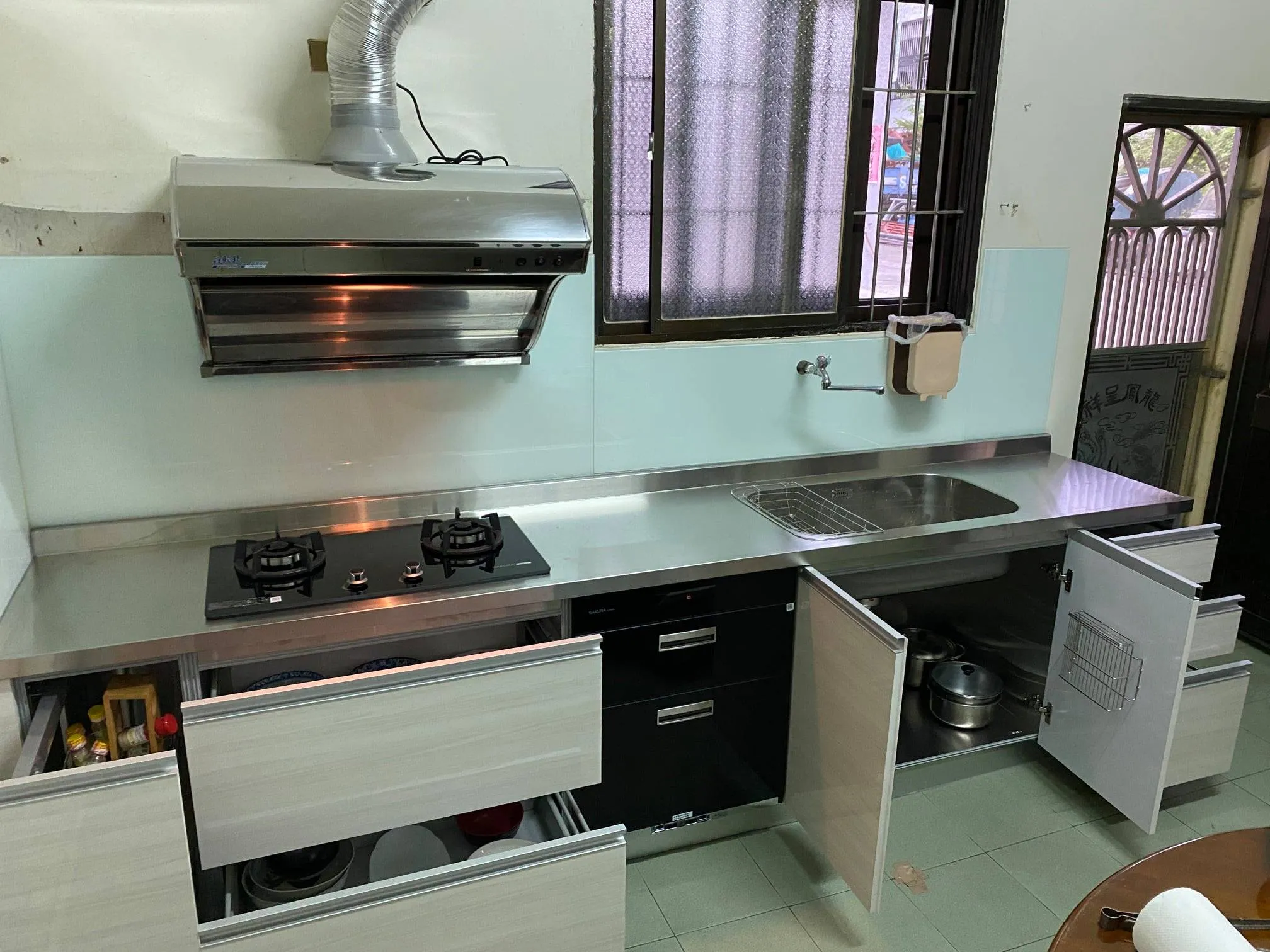 黃小姐因為瓦斯爐故障來店面請我們到府維修,因瓦斯爐主體結構生鏽嚴重、爐頭使用10幾年有些許變形,經過建議及溝通選擇更換廚具,因為家中剩下自己和先生2人,希望在有限的預算更換收納性高的廚具,因此檯面選擇耐用的不鏽鋼,又因為喜歡料理電器配備多到沒地方擺放,所以多做了2組電器櫃讓電器們都有自己的家。