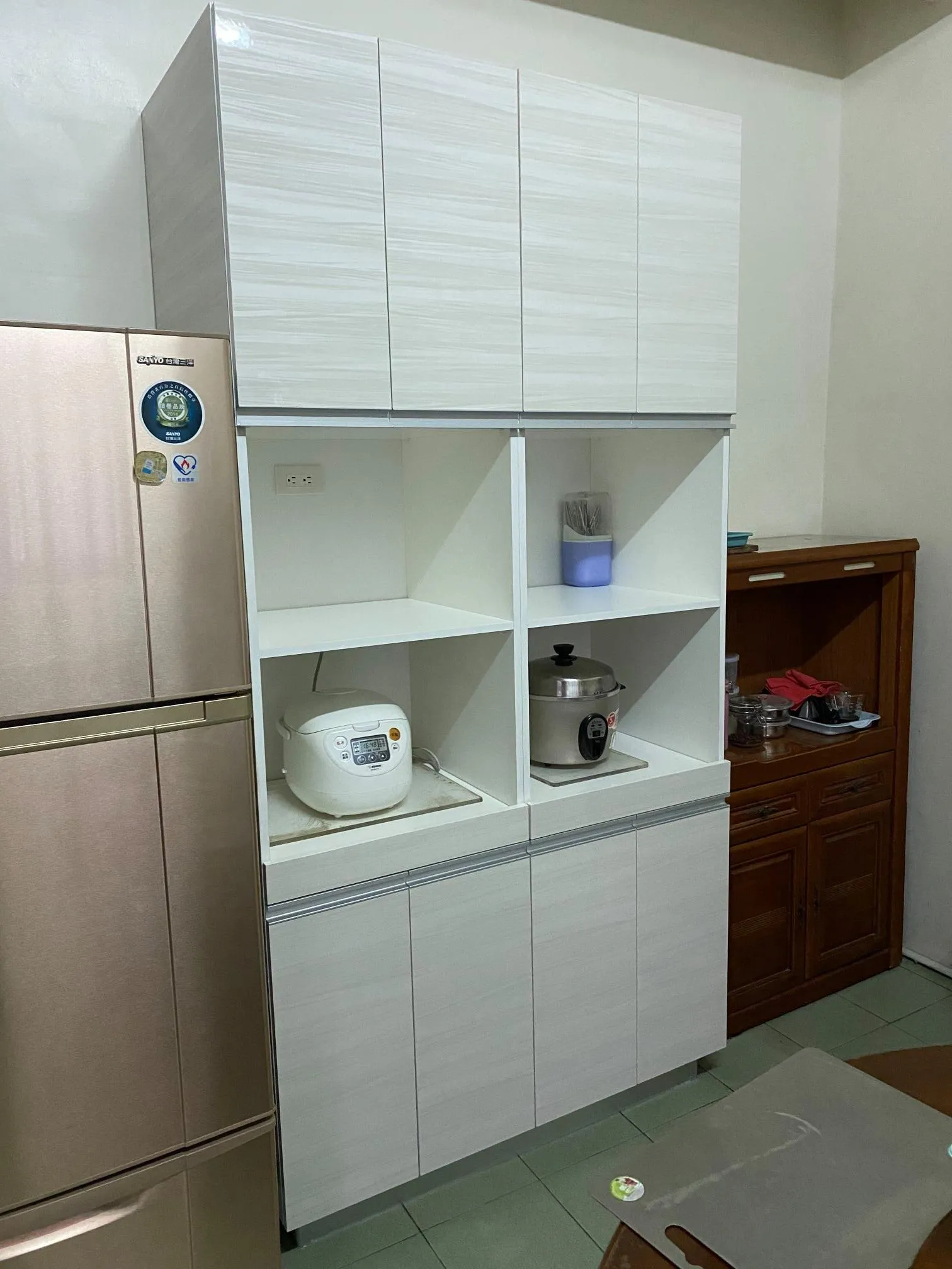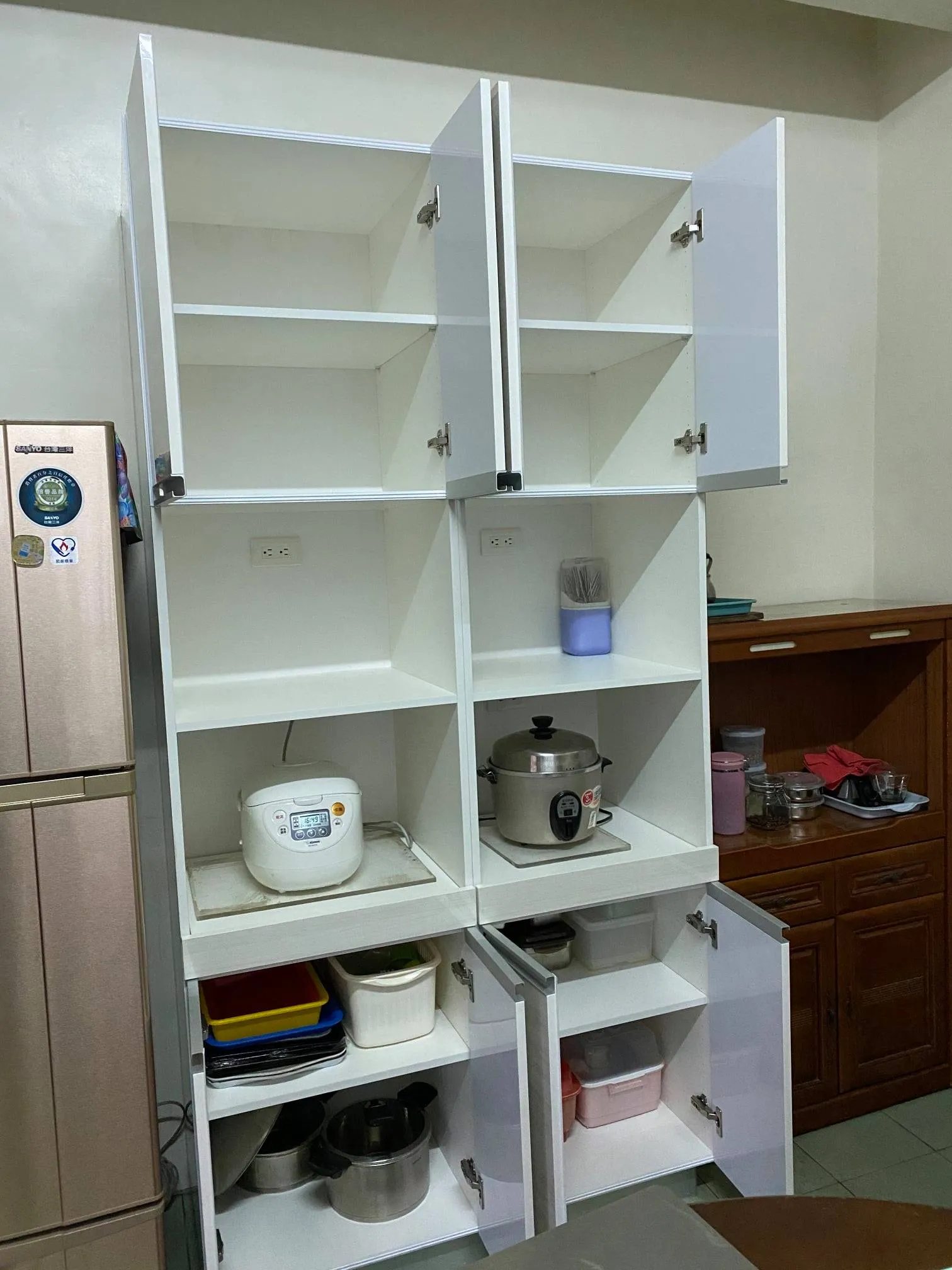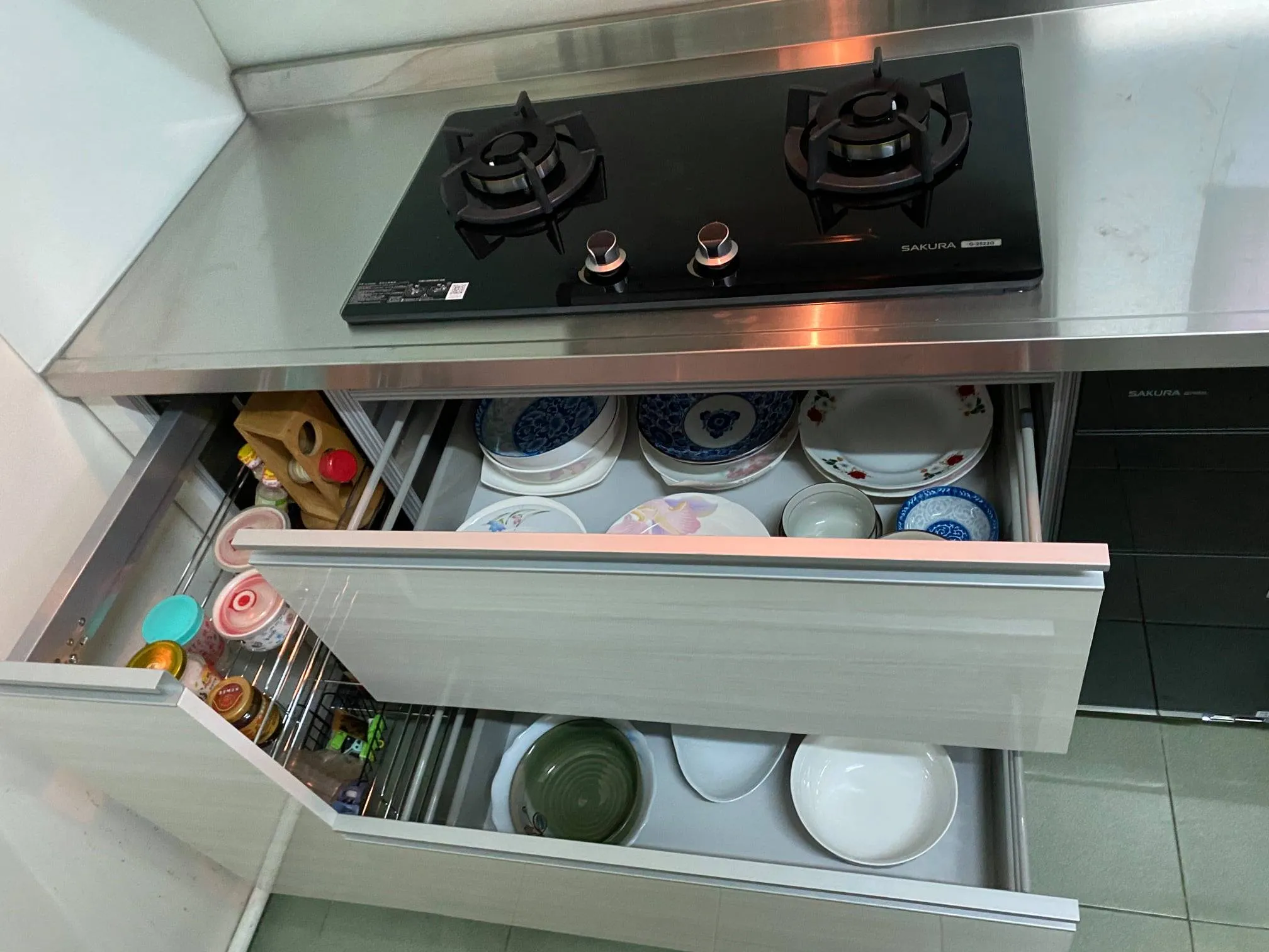 黃小姐因為瓦斯爐故障來店面請我們到府維修,因瓦斯爐主體結構生鏽嚴重、爐頭使用10幾年有些許變形,經過建議及溝通選擇更換廚具,因為家中剩下自己和先生2人,希望在有限的預算更換收納性高的廚具,因此檯面選擇耐用的不鏽鋼,又因為喜歡料理電器配備多到沒地方擺放,所以多做了2組電器櫃讓電器們都有自己的家。